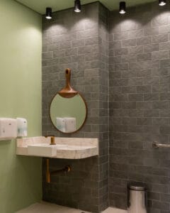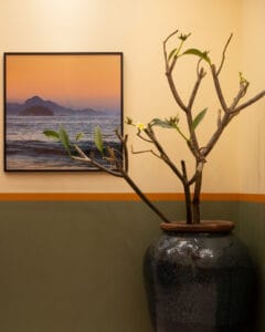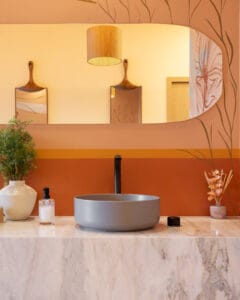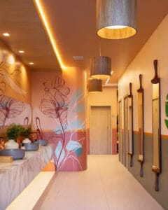 DE PRESENTE, O AGORA. Tema da CASACOR 2024 nos fez refletir sobre a vida. As cores terrosas remetem ao início da vida, e os tons verdes trazem o significado da vida pulsante. As cores vibrantes e as cores pasteis também fazem essa relação com o passado e o futuro cortado pela linha dourada do AGORA.