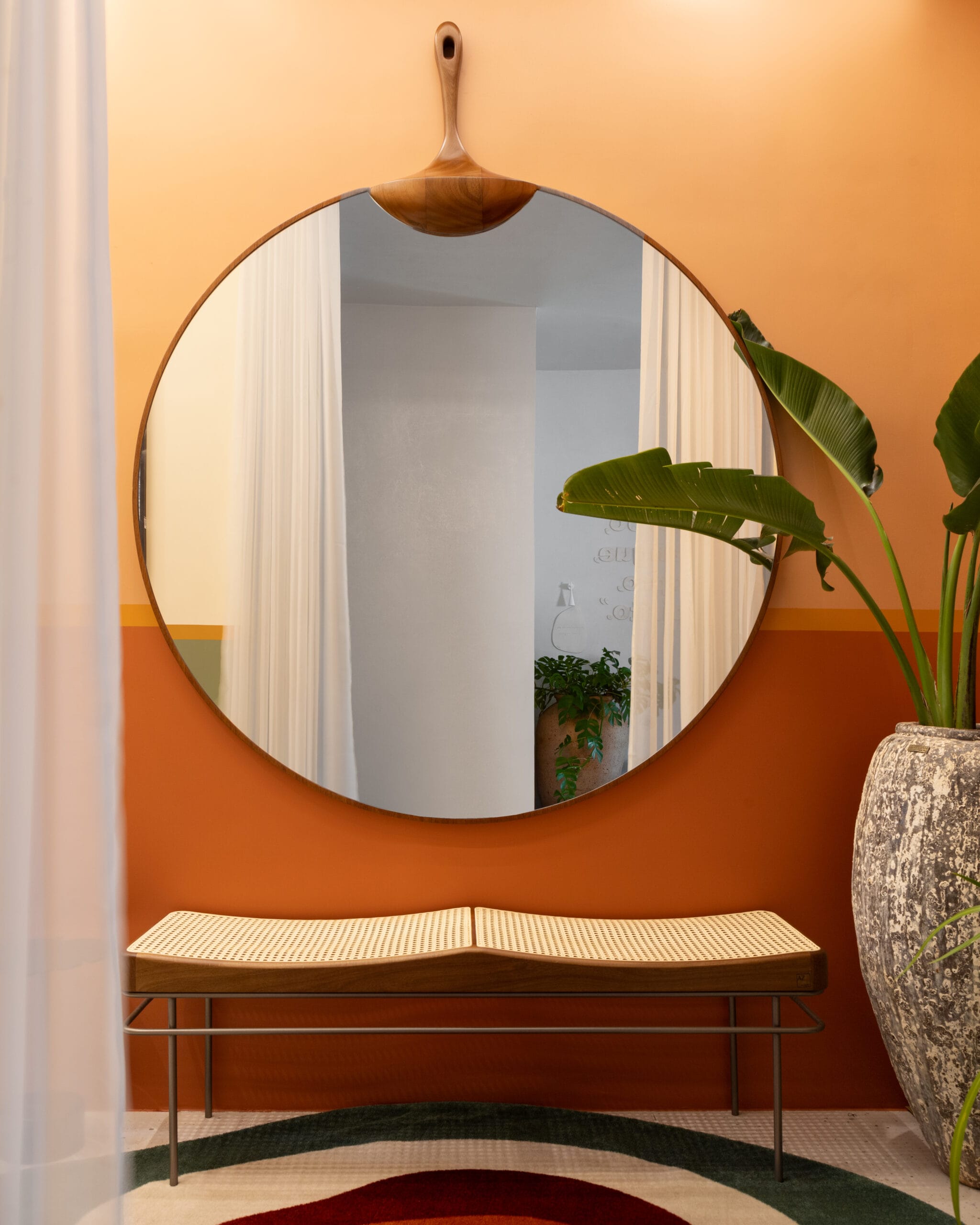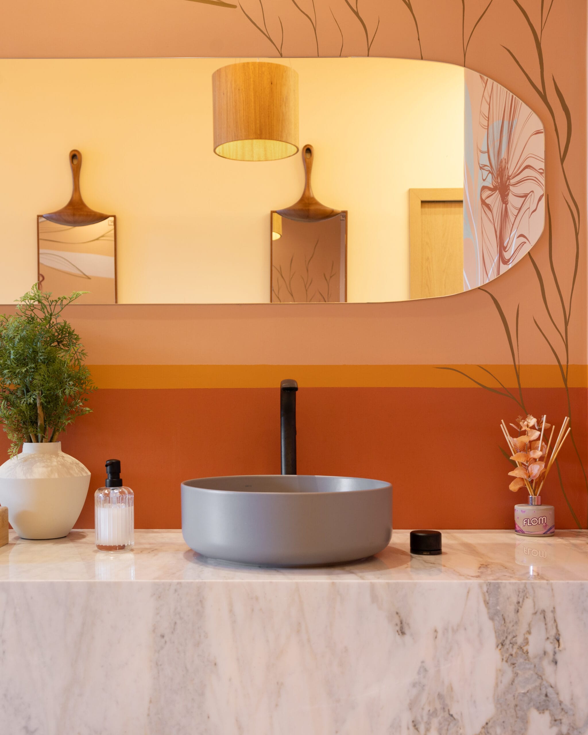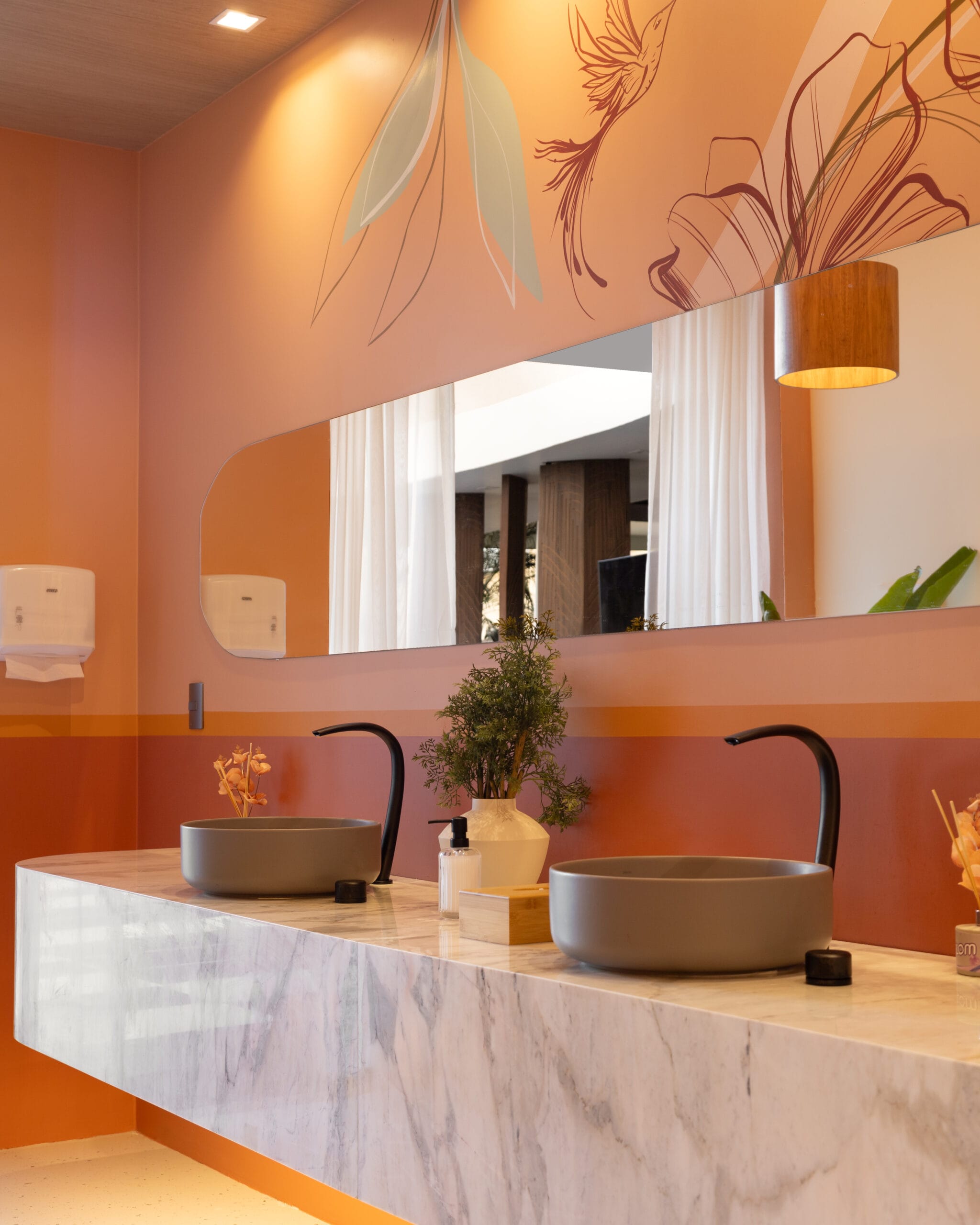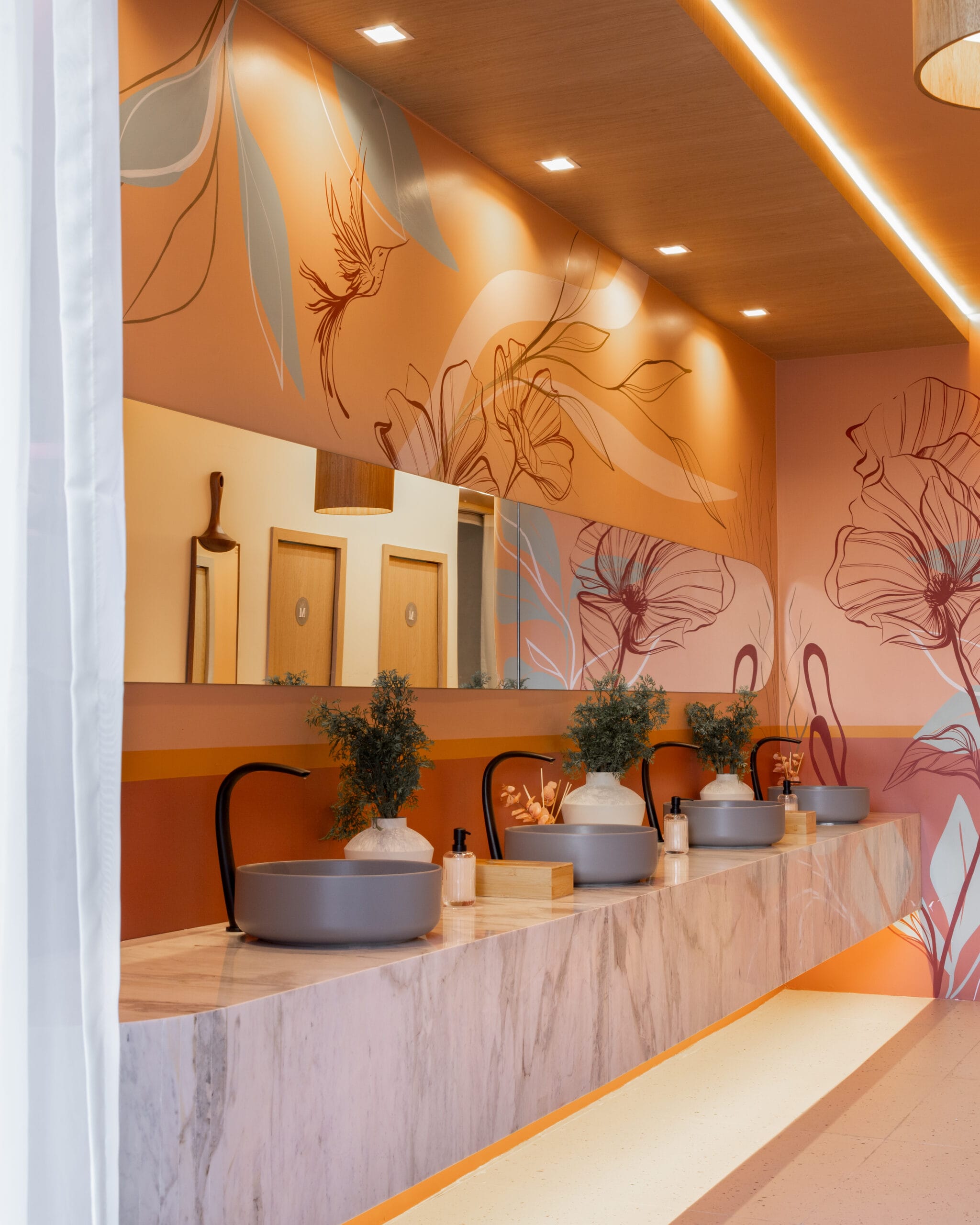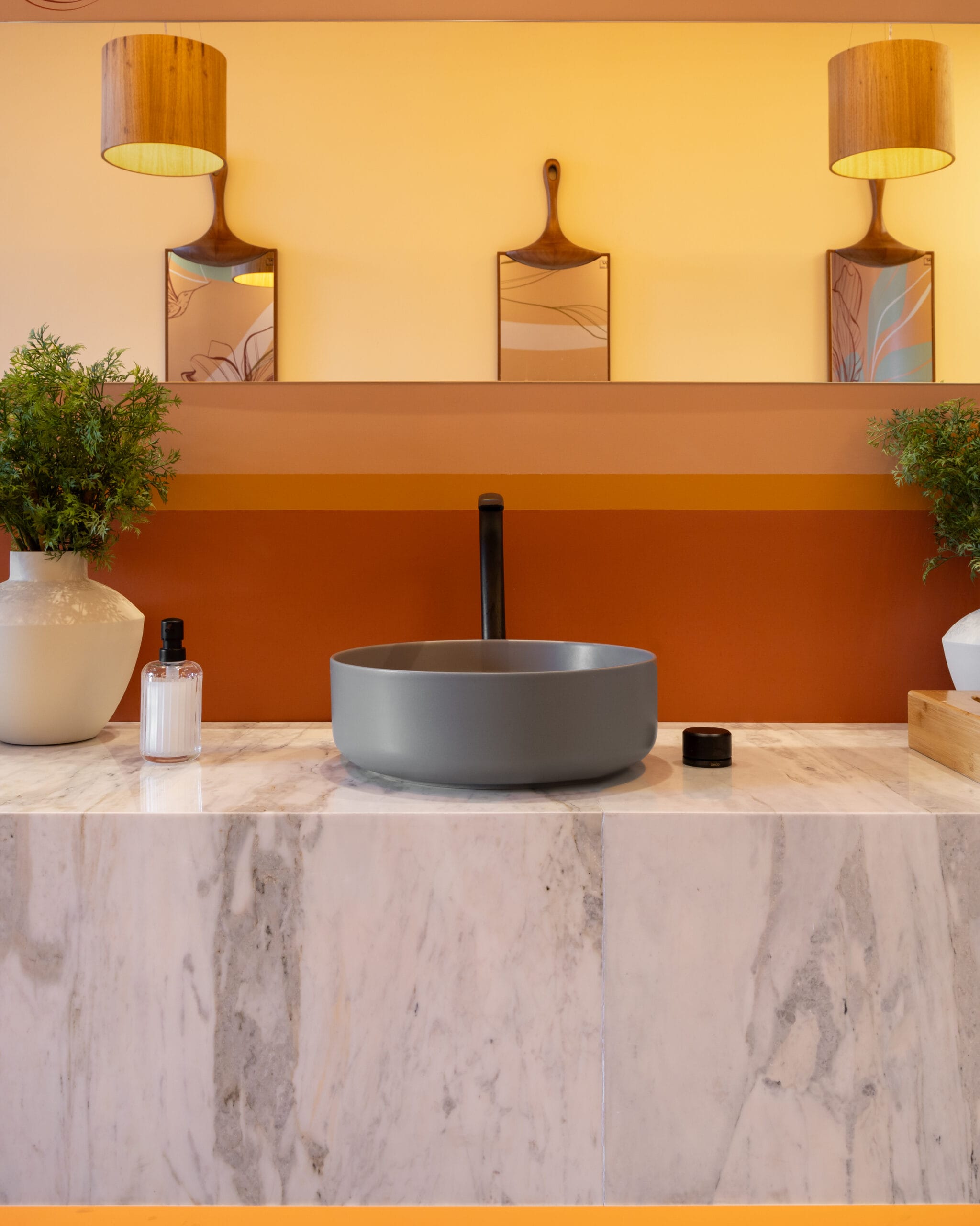 DE PRESENTE, O AGORA. Tema da CASACOR 2024 nos fez refletir sobre a vida. As cores terrosas remetem ao início da vida, e os tons verdes trazem o significado da vida pulsante. As cores vibrantes e as cores pasteis também fazem essa relação com o passado e o futuro cortado pela linha dourada do AGORA.